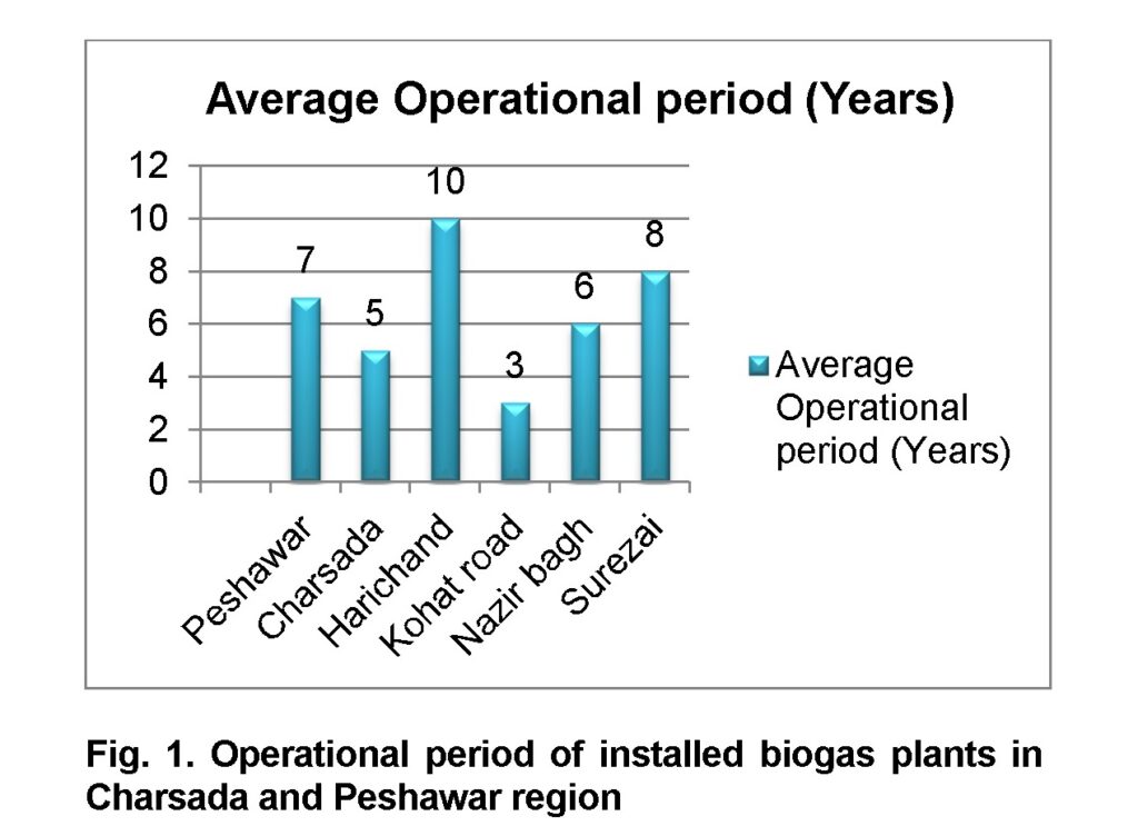 The study tool and research methodology followed by our team were mainly in line with the objective of the study. We collected both primary and secondary data, interactive approach was used; structured questionnaires, and open minded unstructured interviews were commenced, followed by observation of cattle shades and slurry pits. A detailed survey of biogas plants was done in KPK (Khyber Pakhtunkhwa) Province. Overall, 18 samples were visited and information was collected. The collected information contains the Operational years. Four plants were visited in Peshawar and their average operational period is seven years. Three plants were visited in charsada having five average operational years. So as Harichand, Kohat Road, Nazir Bagh and Surezai with their operational years of five, one, three and two respectively. The data then verified and analysed using MS EXCEL and MS Word and then being incorporated in Figure 1.
