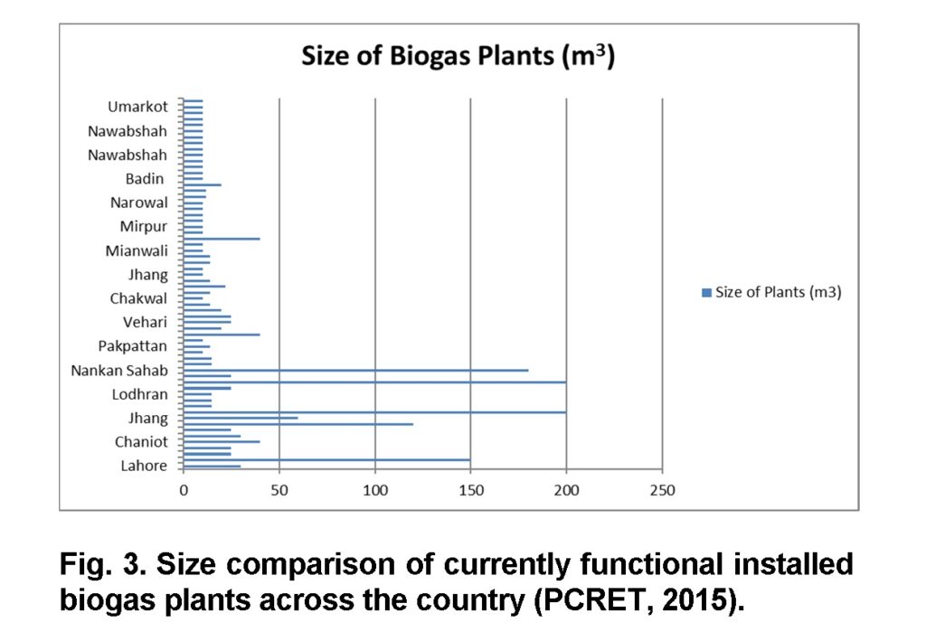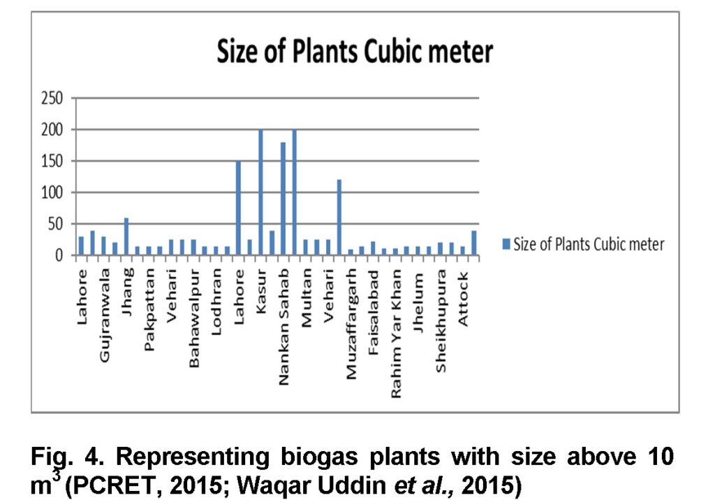 All these biogas plants (Figure 3) are greater than 10 cubic meters in size. Largest of them are 200 cubic meter power plants, one of them is planted in Kasur and other in Multan. The one in Kasur is installed in “Cheema Poultry Farm” which is used for power generation and its power is 75 KW. The second major biogas plant in Multan is planted at “Almashriq Dairy Farm” connected to a power generator of 50 KW. The province wise installed biogas plants data by PCRET is presented (Table 3). This data shows there is a potential for the establishment of commercial biogas sector. Which will not only helpful in mitigating the energy crisis, but also have a positive impact on the environment and economy of the country.