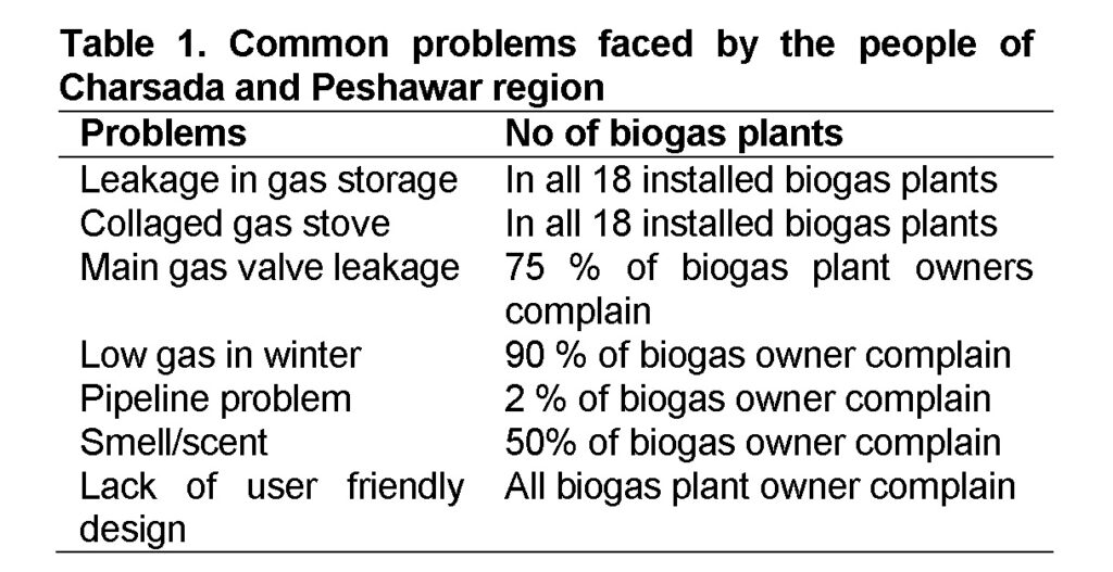 In charsada and Peshawar region 18 biogas plants were analysed. The level of satisfaction of people (Figure 2) and the common problems faced by biogas users are presented (Table 1).