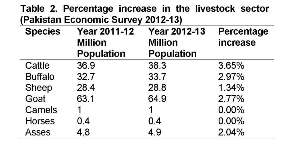 The average increase in livestock from 2011 to 2013 is shown (Table 2). Cattles increased from 3.6 million to 38.3 million with a percentage increase of 3.65% in just two years. The buffalos were 32.7 million according to 2011-12 survey and increased to 33.7 million in 2012-2013 that shows percentage increase of 2.97%. Percentages for sheep, goats and asses also increased in these years, but the number of camels and horses remained same. Livestock provides sources of income for 45 percent of countries labor force and 60% of rural population contributing 11.6% to national grass domestic product (GDP) and 55% to agriculture GDP (Economic Survey of Pakistan, 2012; Iqbal et al., 2013; Iqbal et al., 2014; Muhammad et al., 2015). Livestock is contributing to the economy of Pakistan but the challenge faced by livestock is various gastrointestinal diseases (Iqbal et al., 2014). This large number of livestock with constantly increasing percentage every year produces an enormous amount of dunk. This dunk could be the cheapest raw material for a Biogas plant. Production of biogas from such a cheap and largely available raw material makes biogas a cheaper source of energy.