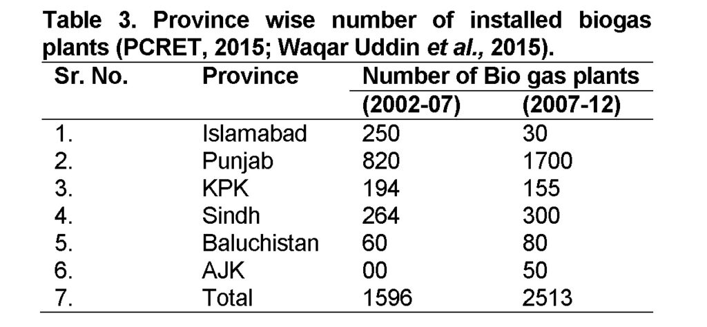 Biogas generation started a few decades ago. In 1974, the government of Pakistan starts a scheme, comprising of three phases, and installed 4137 plants by the year 1987 across the country. These were drum type floating biogas plants with capacity of 5-15 m3 gas production per day. This scheme was successful during the first two phases, but failed all together as the government stopped financial support. PCRET is the leading centre in the country for installation of biogas units. Besides PCRET, Initiative for Rural and Sustainable Development (IRSD), an NGO (Non-Government Organization) with the support of UNDP (United Nations Development Program) installed 1500 biogas plants. There is another NGO “Koshish”, which in Sialkot Punjab installed 200 plants, in collaboration with NGO Green Circle (Ghimire, 2007).