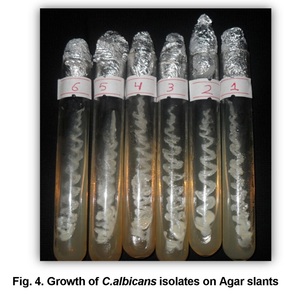 A loopful of each Candida albicans isolates were transferred individually from agar slants into tubes containing 4 to 5 ml of decontaminated brain heart infusion broth (BHIB). The cultures broth was then placed in an incubator for 18-24 hrs at 37°C. After incubation period amount of these fresh cultures were transferred by sterile syringe into another tube containing sterile normal saline for turbidity which is analogous to McFarland standard. As a result almost 1 to 2×108 CFU/ ml Candida albicans was obtained in a suspension.