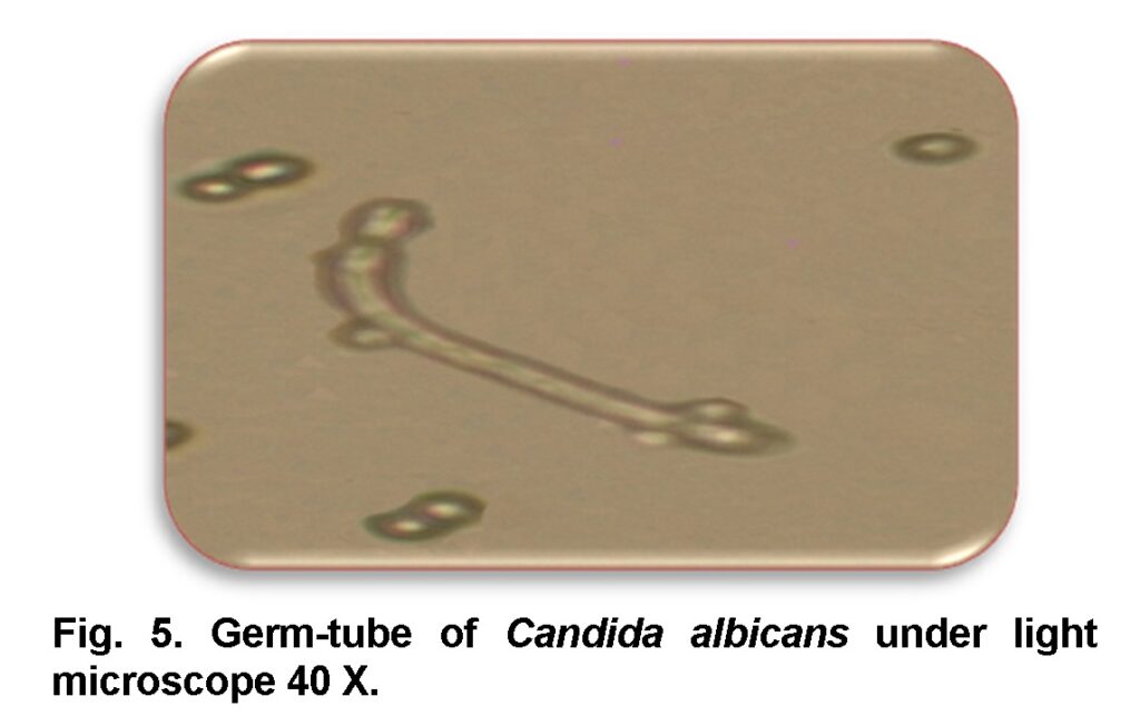 The growing strain was then subjected to germ tube test for identification of C.albicans by using the method of Williams and Lewis, 2000. At room temperature, cells were put off in human serum (0.3-0.5) ml and then incubated at 37ºC for 2 to 4 hrs. After incubation; one or two drops of culture was positioned on a clean glass slide and observed under microscope (Figure 5).