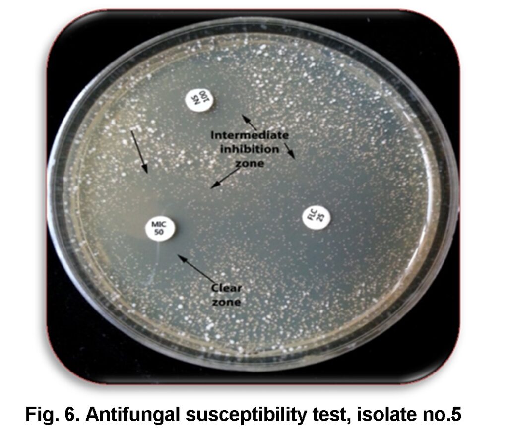 Our results illustrated that C.albicans isolates showed various sensitivity to antifungal agents (Table 3). Results showed that miconazole 50µg could effectively inhibit the growth of all isolates with clear zone, except isolate no.5 which showed intermediate inhibition zone 13mm and clear inhibition zone 5mm (Figure 6). This means that none of the isolate was resistant to miconazole. Similar results were also obtained by Carvalinho and Costa (2012) who did not find any isolate resistant to this antifungal.