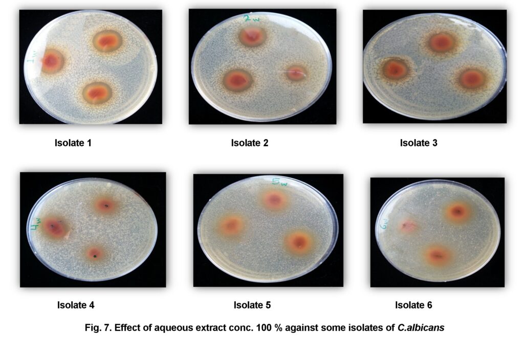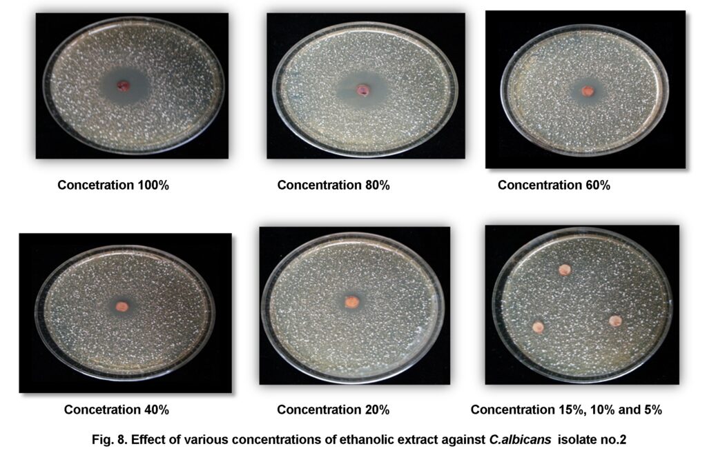 According to our results ethanolic extract showed various inhibitory effects against C.albicans isolates. One hundred percent concentration inhibited the growth of all isolates with large and clear inhibition zones except isolate no.5 and 6 which showed large but intermediate inhibition zone.