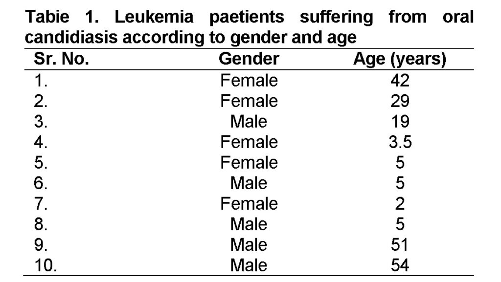 The samples were collected from 10 leukemia patients suffering from oral candidiasis from three hospitals in Sana’a city (Al-Thawra hospital, Al-Gomhore hospital, and Al-Kuwait University hospital) (Table 1).