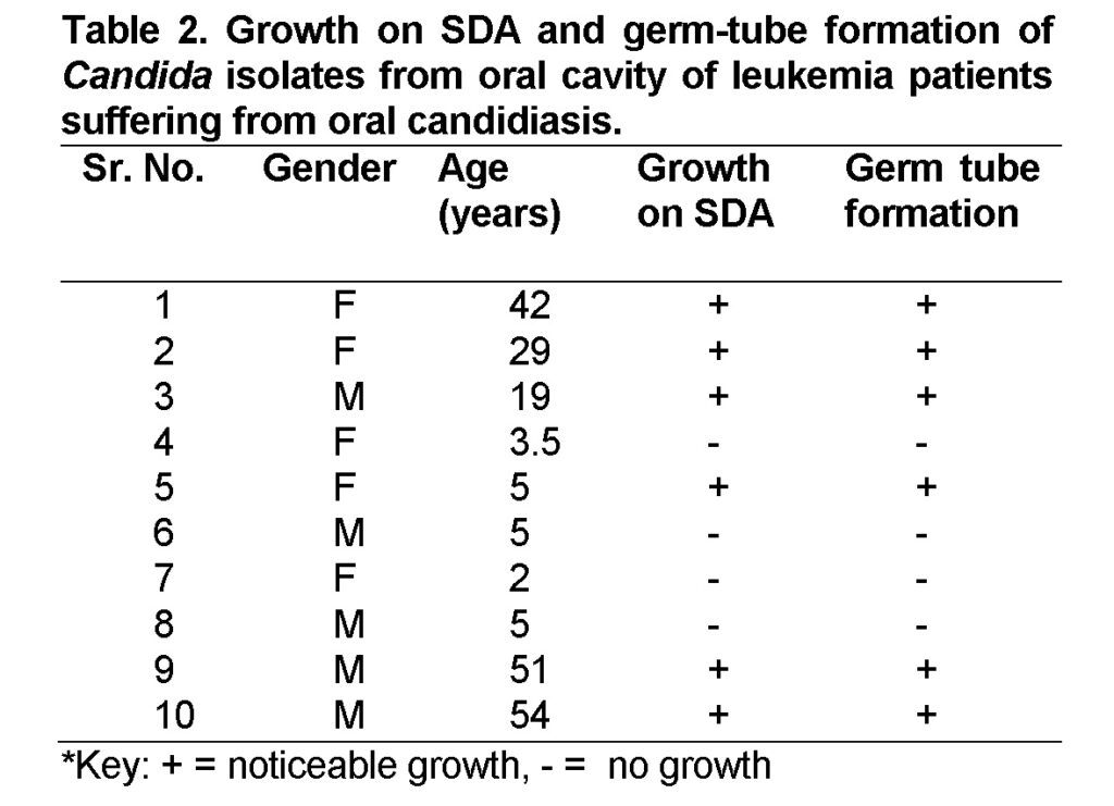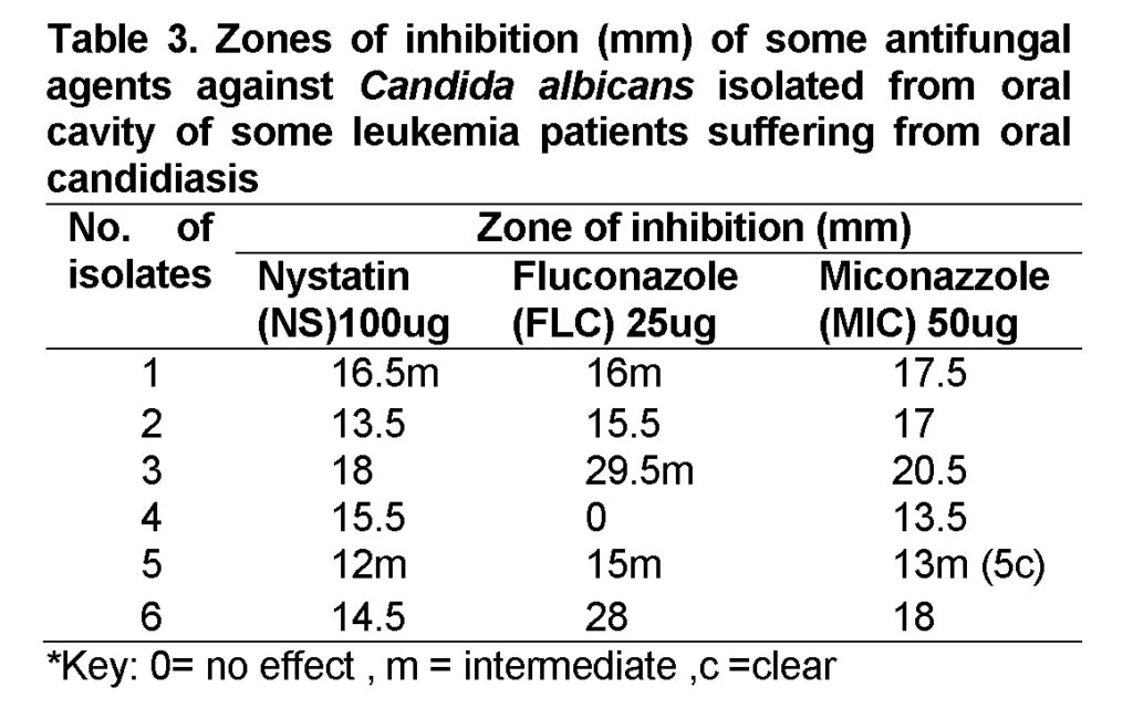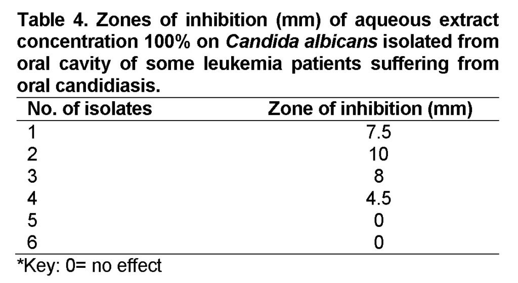 A total of 6 isolates of Candida albicans were purified from oral cavity of ten leukemia patients suffering from oral candidiasis. The results showed that six of the ten oral swabs gave noticeable and significant growth on Sabouraud’s dextrose agar SDA, while four of them didn’t give any growth on the same medium (Table 2). These four swabs were from leukemia patients aged between 2 to 5 years. So the negative results of these swabs maybe due to mistakes during sampling. The morphology of colonies on SDA of the six isolates were cream, smooth, pasty, and convex. Microscopic examination of the isolates showed budding cells that identify yeasts. Germ-tube test showed that all of the positive swabs were Candida albicans, that is approves with previous studies of Odds,1988; Sinnett et al., 1992; Raju and Rajappa, 2011who stated that C.albicans as the most frequently cultured Candida species from oral cavity.