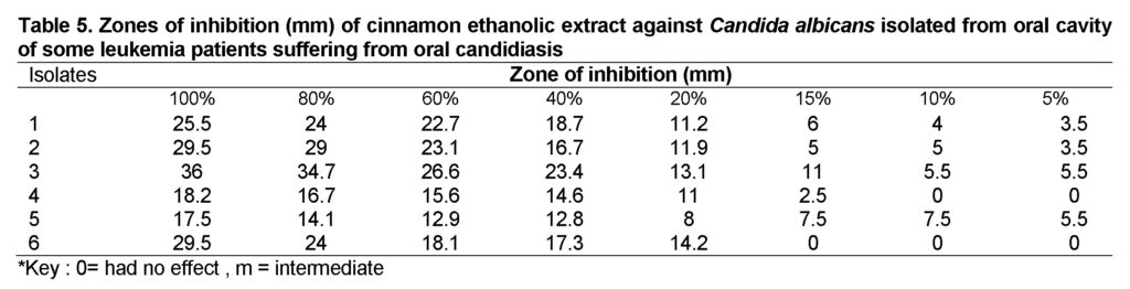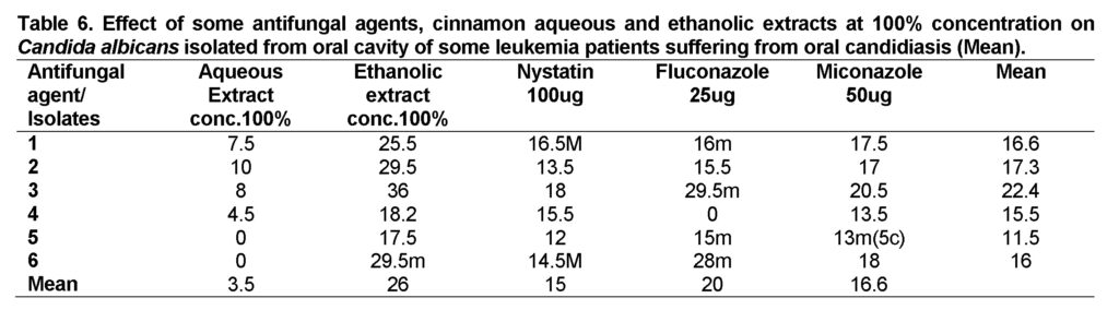 Hence, the present study was designed to extract the cinnamon in aqueous and ethanolic state and study the effect of cinnamon extracts against some isolates of Candida albicans obtained from oral cavity of leukemia patients suffering from oral candidiasis, and compared with some antifungal agents.