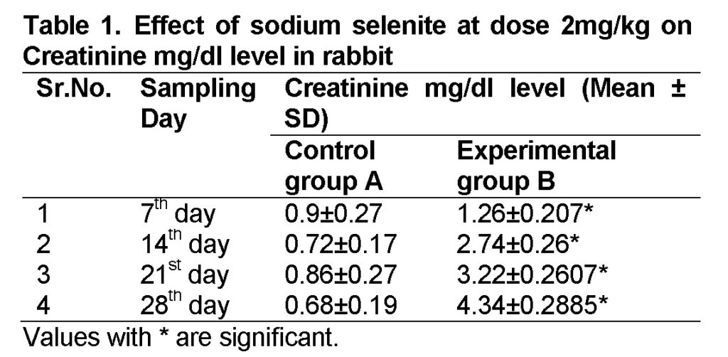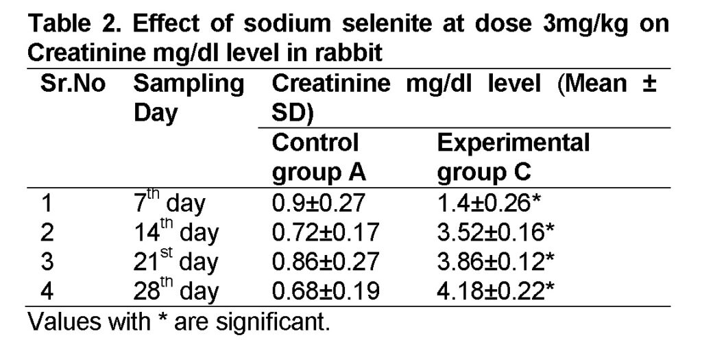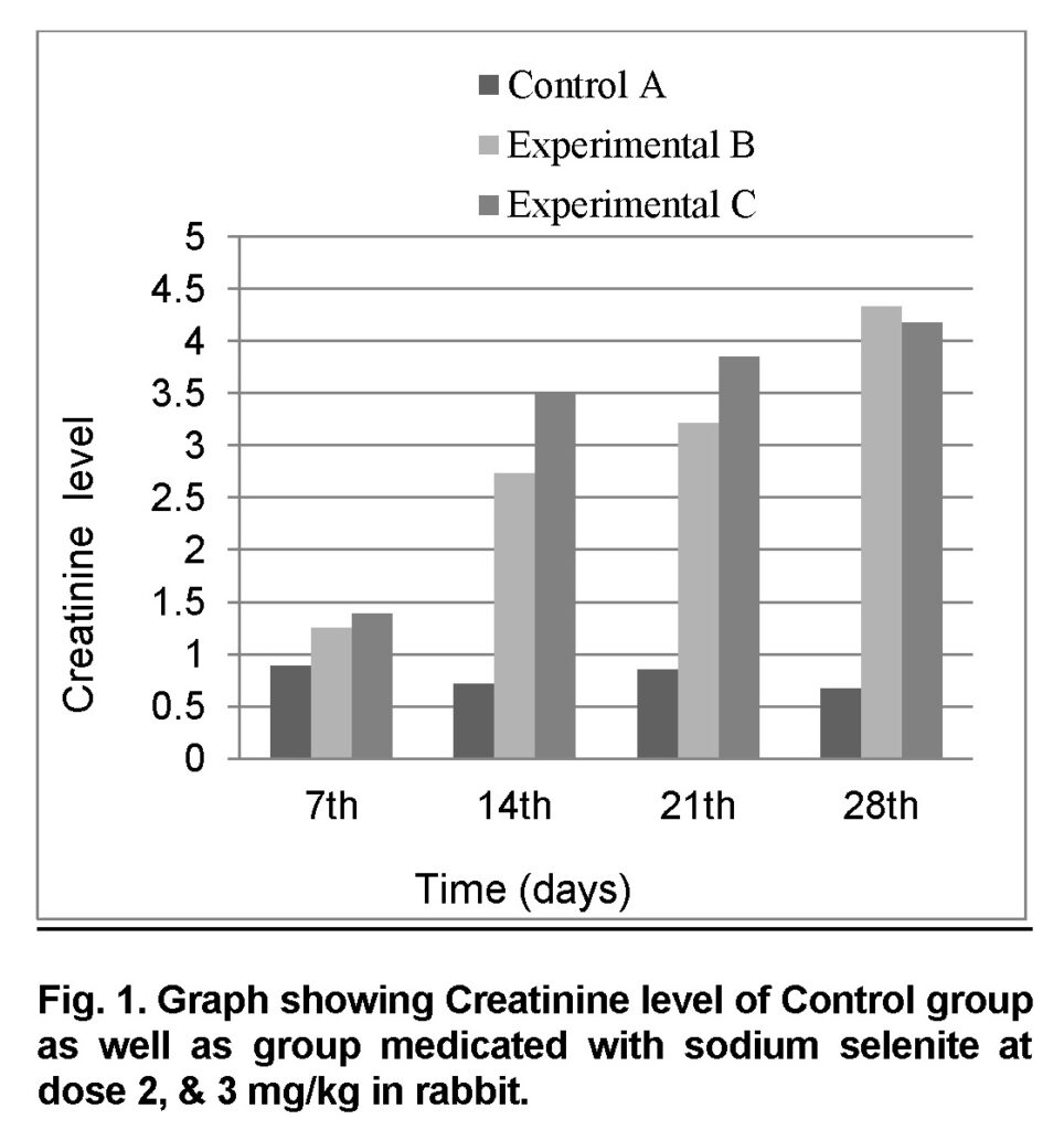 Influence of Sodium selenite at dose of 2mg/kg in group “B” was analyzed. The mean values of Creatinine in experimental group B on 7st, 14th, 21th, and 28th days were 1.26 ± 0.207, 2.74 ± 0.26, 3.22 ± 0.2607 and 4.34 ± 0.2885 mg/dl (Table 1). The level of Creatinine increased in group “B” as compared to control at the end of 28th day of the experiment (Figure 1). The value of F was 10.746 showed highly significant results. The level of significance was 0.017 that is less than 0.05.
