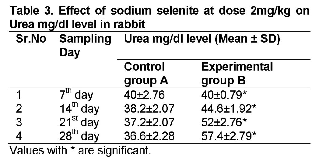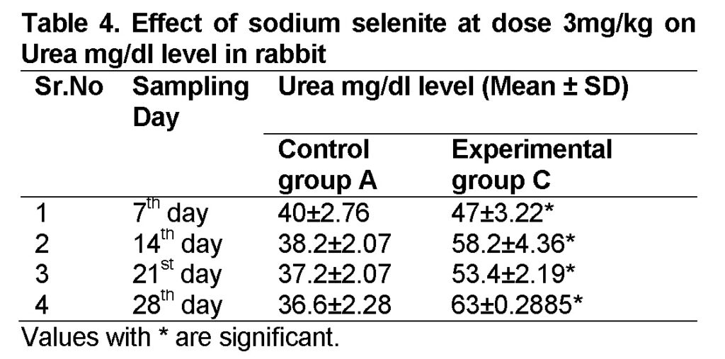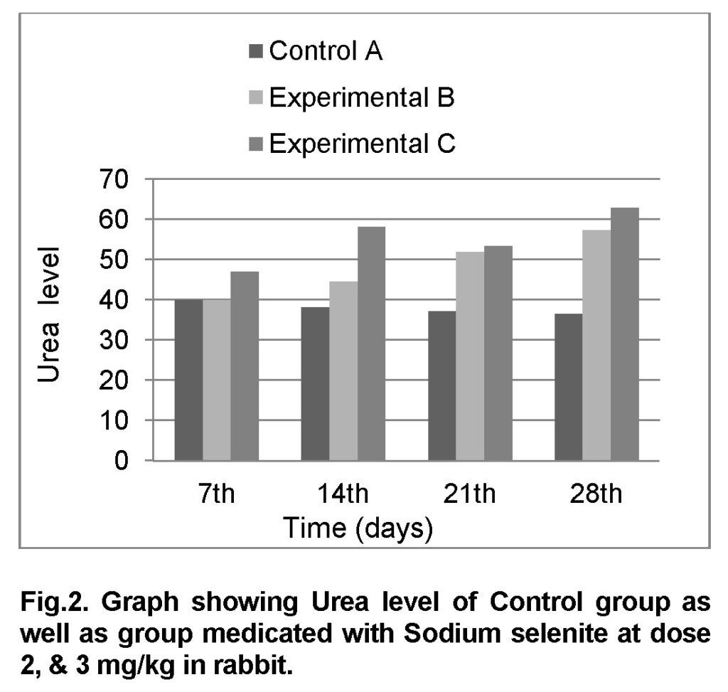 Influence of Sodium selenite at dose of 2mg/kg in group “B” was analyzed. The mean values of urea level in experimental group B on 7st, 14th, 21th, and 28th days were 40 ± 0.79, 44.6 ± 1.92, 52 ± 2.76 and 57.4 ± 2.79 mg/dl (Table 3). The level of urea was increased in group “B” as compared to control at the end of 28th day of the experiment (Figure 2). The value of F was 7.130 showed highly significant results. The value of significance was 0.037, is less than 0.05.