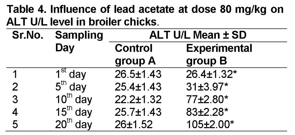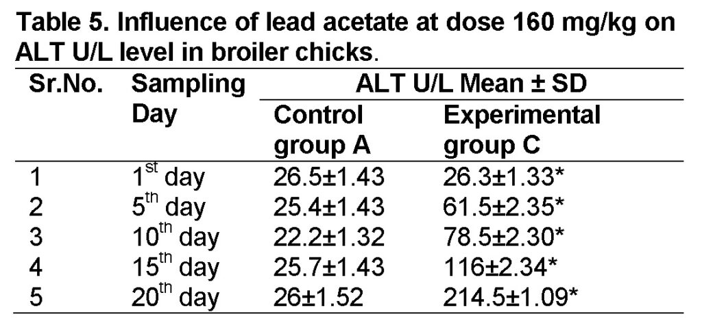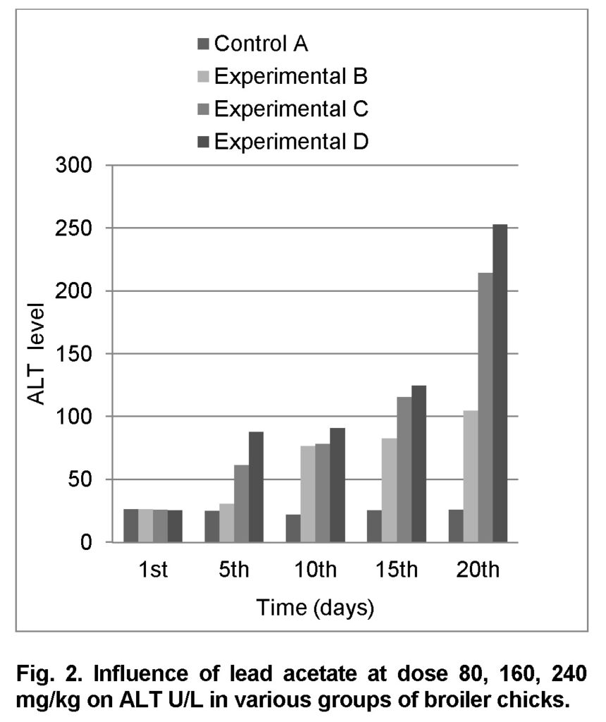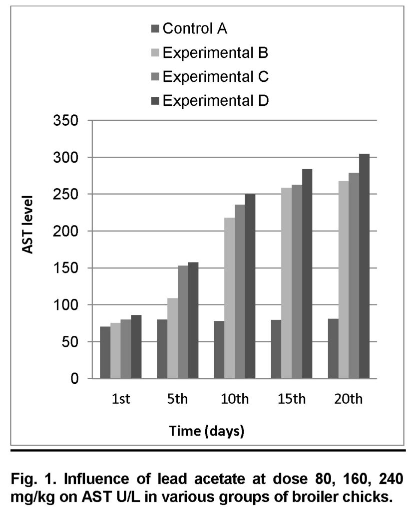 In current study, the lead acetate toxicity on the liver functioning enzymes (AST & ALT) was investigated in broiler chicks (Gallus domesticus). The liver is largely affected by lead toxicity owing to its storage in the liver after lead exposure. The elevation in level of enzymes might be due to higher cell membrane permeability or damage of hepatocytes due to lead acetate (Tatjanaet al., 2003).