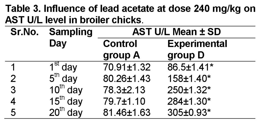 Al-Wabel et al, (2007) has demonstrated the same results in rat treated with lead acetate showing the increased level of ALT. Similar results have also been documented by Ashmawy et al, (2005), who illustrated that lead acetate has a toxic effect on liver increasing the level of ALT. In a previous study of effect of lead acetate administered orally at various dosage levels in Broiler chicks, a significant increase in AST in chicks was reported by Suleman et al ., (2011) as same is the case in our study.