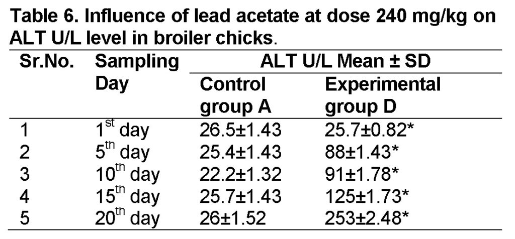 Influence of lead acetate at dose of 240mg/kg in group “D” was observed. The values of ALT in experimental group D on 1st, 5th, 10th, 15th and 20th days were 25.7 ± 0.82, 88 ± 1.43, 91 ± 1.78, 125 ± 1.73 and 253 ± 2.48 respectively (Table 6). The increase in ALT level is significant in group “D” as compared to control at the end of 20th day of the experiment. The value of F was 5.876 showed highly significant results. The value of significance was 0.042, is less than 0.05.