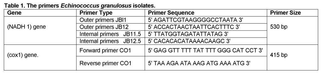 The primers for mitochondrial NADH dehydrogenase subunit 1 and cytochrome C oxidase subunit 1 gene for EG isolates (Bowles and McManus, 1993; Ibrahim et al., 2011) were used (Table 1).