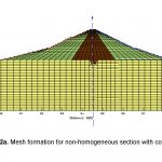 In order to fulfill the objectives of the present research work by using Geo-Slope software (SEEP/W), cross sections were developed for 2 cases i.e. (i) non-homogeneous section with core, and (ii) non-homogeneous section without core respectively. The hydraulic conductivities of the materials used in mesh development of the cross sections and dimensions remain same except for core. The meshes are composed of triangular, square, rectangular and trapezoidal type of elements (Arshad et al., 2015). The mesh for case (i) comprised of 2,399 nodes and 2,341 elements, while for case (ii) 2,346 nodes and 2,251 elements were used (Arshad, 2015). Computations were carried out for three different cases i.e. maximum (346 ft), minimum (270 ft), and normal pond level (339 ft) respectively. Figure 2a and 2b describes the mesh formation of non-homogeneous section with and without core respectively.