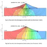 In present research work, the slave program (SEEP/W) of a finite element based software i.e. Geo-Slope was used to check the behavior of a non-homogenous earth dam for two different cases i.e. (i) with core and (ii) without core respectively. The software was used to simulate total head contours, velocity vectors and the phreatic surface respectively. The simulated results for a non-homogenous section of a (Hub dam) at a chainage (CH: 48+75), showed that at original shape and design with core (case – i) the dam is not endangered from an internal erosion and piping, as the central core plays a key role in lowering the phreatic surface within the dam. For each scenario the equipotential lines and stream lines are found normal to each other. The movement of velocity vectors after passing the core was towards filter drain which conforms; the seepage theory with overall minimum seepage flux of 2.0291 x 10-4 ft3/sec/ft and exit gradient at downstream toe 0.091 respectively.