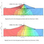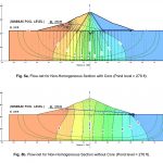 Similarly seepage flux and exit gradient for the minimum pond level was computed for both cases. Figure 5a showed that at minimum pond level the dam with core is having seepage flux of order 2.0291 x 10-4 ft3/sec/ft and exit gradient 0.091 respectively. The trend of phreatic line was relatively similar as observed in normal and maximum pond levels and the streamlines and equipotential lines were also normal to each other which conforms; the seepage theory. Similar results were observed by (Khattab, 2010), during the case study of Mosul dam, who also computed seepage flux and exit gradient along with phreatic line behaviour for different scenarios.