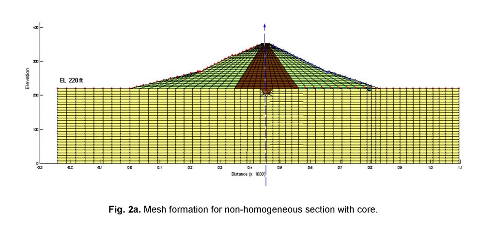 In order to fulfill the objectives of the present research work by using Geo-Slope software (SEEP/W), cross sections were developed for 2 cases i.e. (i) non-homogeneous section with core, and (ii) non-homogeneous section without core respectively. The hydraulic conductivities of the materials used in mesh development of the cross sections and dimensions remain same except for core. The meshes are composed of triangular, square, rectangular and trapezoidal type of elements (Arshad et al., 2015). The mesh for case (i) comprised of 2,399 nodes and 2,341 elements, while for case (ii) 2,346 nodes and 2,251 elements were used (Arshad, 2015). Computations were carried out for three different cases i.e. maximum (346 ft), minimum (270 ft), and normal pond level (339 ft) respectively. Figure 2a and 2b describes the mesh formation of non-homogeneous section with and without core respectively.