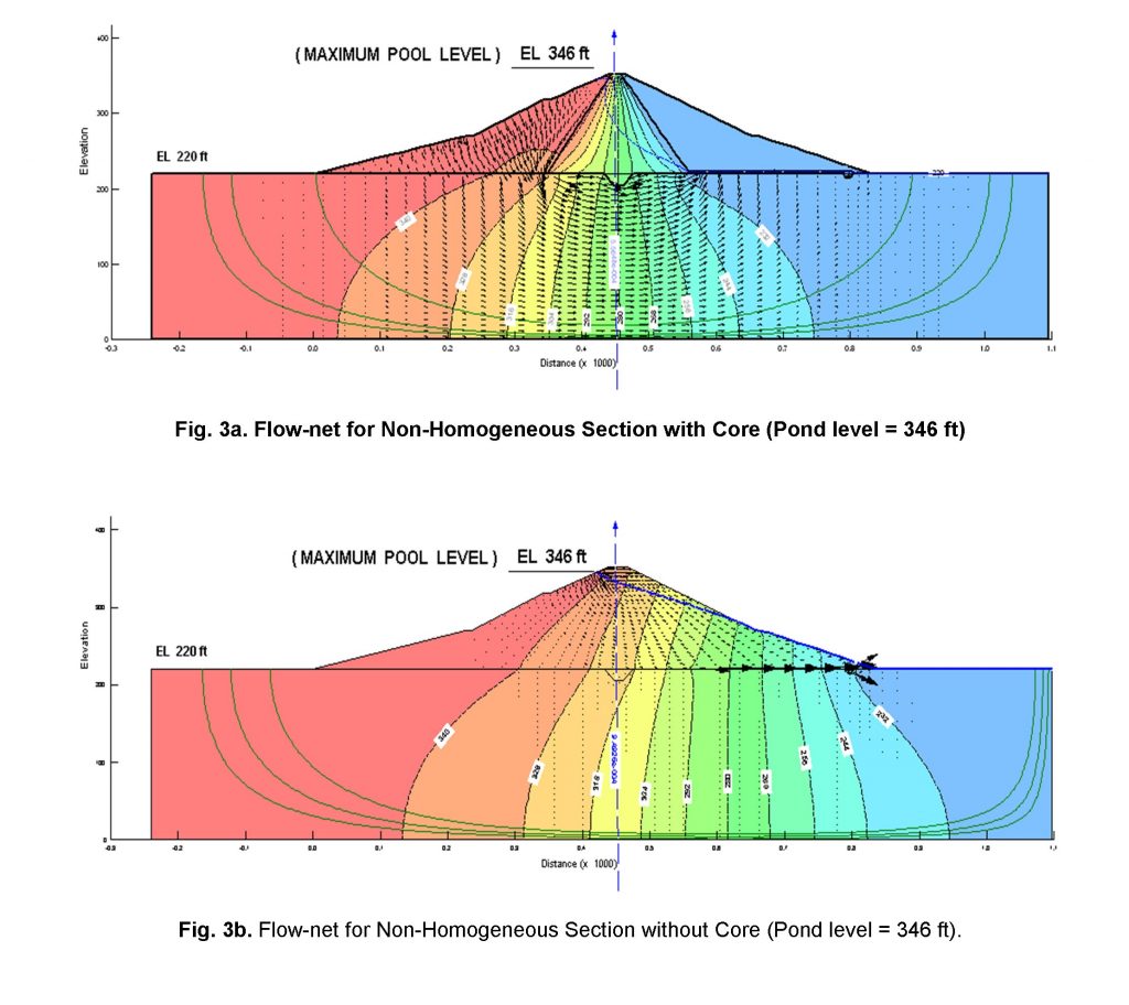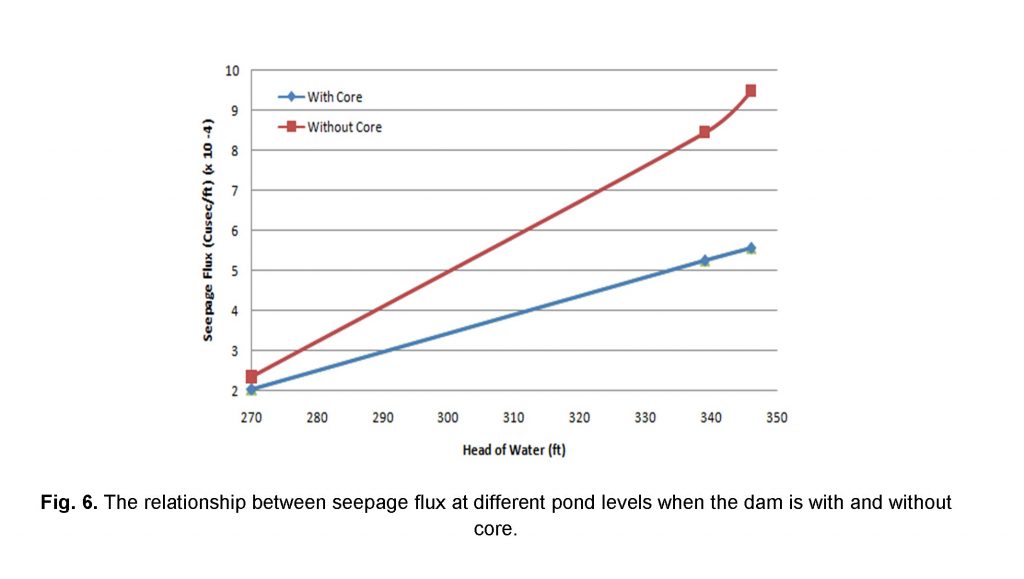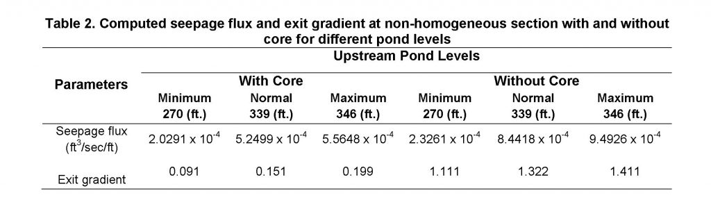 The SEEP/W software was used to compute the seepage flux and exit gradient for two different cases i.e. (i) a dam with core and (ii) without core through the dam and its foundation respectively. The seepage and exit gradient was computed at three different pond level scenarios. The SEEP/W software gives output in terms of flow-net which comprises of the total head contours, velocity vectors and phreatic surface respectively. The results showed that the presence of the core has a direct effect on seepage and exit gradient. The purpose of the core was to restrict the phreatic line and internal pore water pressure almost at the upstream face of the dam respectively. Therefore, the chances of phreatic line to cut the downstream slope face of the dam become minimum and controllable. The behavior of phreatic line within the dam for both cases at different pond levels elaborated in respectively in (Figure 3a – Figure 5b).