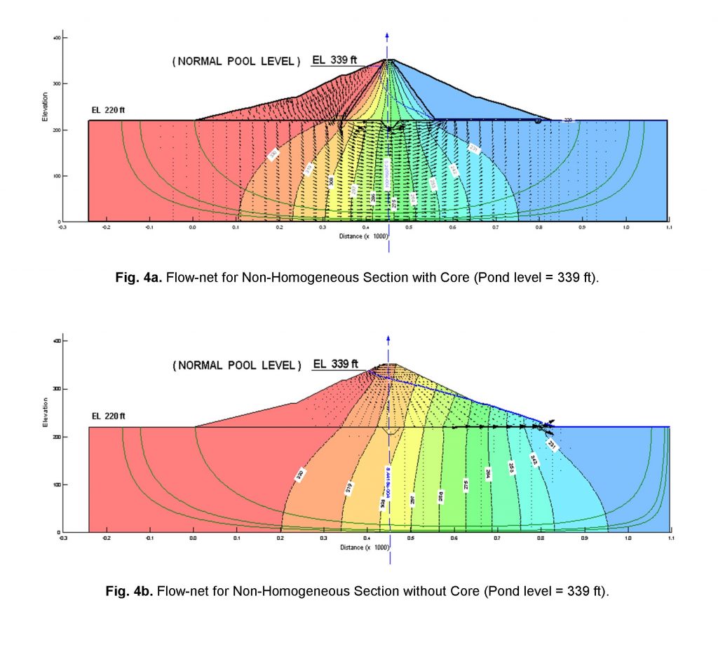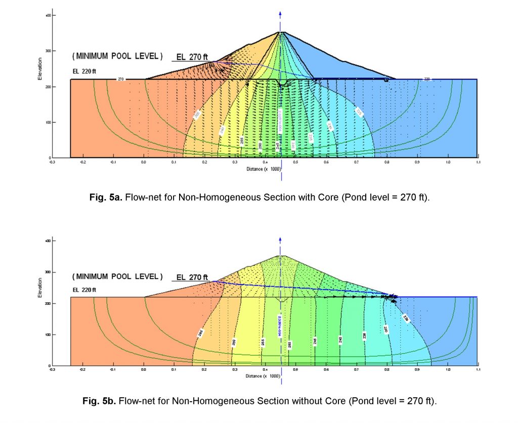 Similarly seepage flux and exit gradient for the minimum pond level was computed for both cases. Figure 5a showed that at minimum pond level the dam with core is having seepage flux of order 2.0291 x 10-4 ft3/sec/ft and exit gradient 0.091 respectively. The trend of phreatic line was relatively similar as observed in normal and maximum pond levels and the streamlines and equipotential lines were also normal to each other which conforms; the seepage theory. Similar results were observed by (Khattab, 2010), during the case study of Mosul dam, who also computed seepage flux and exit gradient along with phreatic line behaviour for different scenarios.