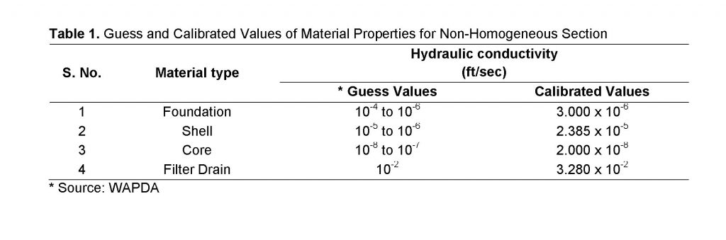 In first attempt initially a cross section for a non-homogenous section was selected to generate FEM mesh and to carry out the critical seepage analysis by using SEEP/W. The units and scale for the drawing page has been set in imperial units and the axes scale was drawn to sketch the model accordingly. Then based on the coordinates obtained from AutoCAD the model was sketched. After sketching the model the domain is then created with the help of region command and dam foundation, shell, core and filter (toe drain) was created with different color respectively (Nasim, 2007). Then by using the key-In command the material properties with different volumetric water content, pore-water pressure and hydraulic conductivity was calibrated and applied to each region respectively. Calibration of the hydraulic conductivities was made on the basis of trial and error, while comparing observed hydraulic heads with the simulated ones (Table 1). Boundary conditions was created and assigned in a similar way as the materials (Aasma, 2016). A hydraulic boundary condition (Dirichlet boundary nodes) was applied on the upstream face of the dam, potential seepage boundary condition (Neumann boundary nodes) was applied on the downstream face of the dam, and zero pressure boundary condition (Neumann boundary nodes) was applied onto the toe drain of the dam where the pressure will be zero kilo-Pascal’s (Arshad et al., 2016). In the final step a newly developed finite element mesh was verified, analyzed and solved by using solve manager option and computation of seepage flux, exit gradient and phreatic line trend for different scenarios of water levels is carried out accordingly.