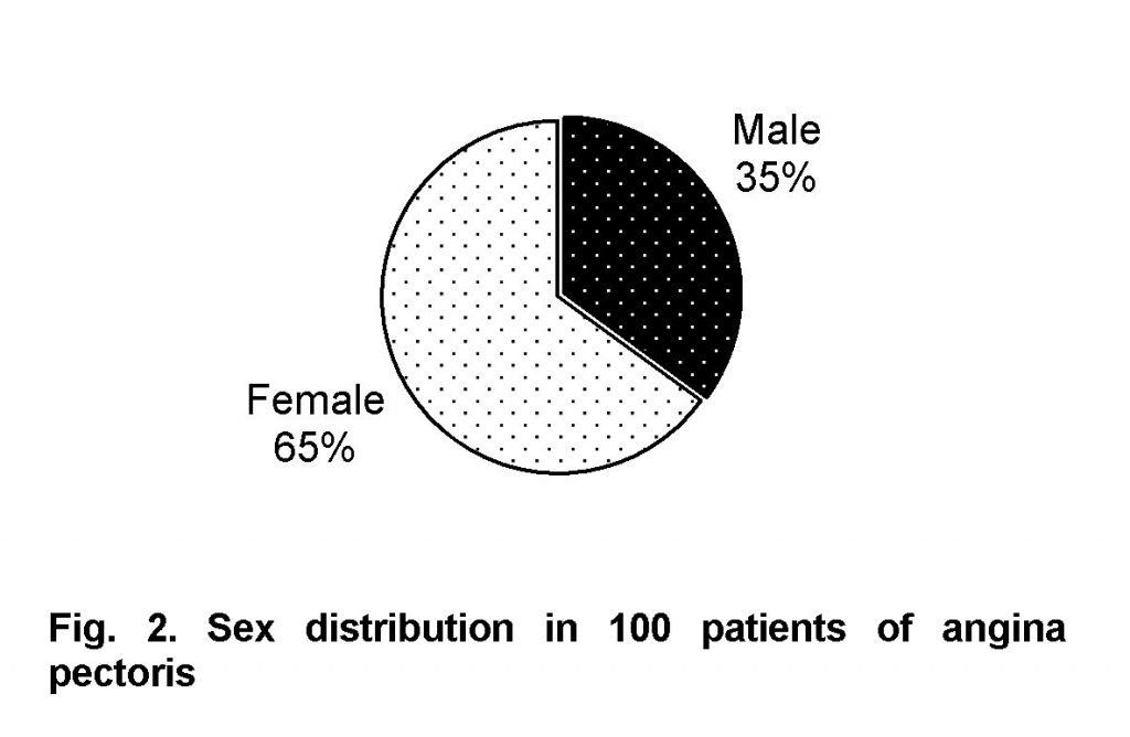 Various risk factors were studied in relation to the incidence of angina pectoris. These include sex, age, occupation, obesity, smoking, diabetes mellitus, premature coronary artery disease, hypertension and alcohol. Higher incidence of angina pectoris had been found in females (65%) than males (35%) (Figure 2). Similarly it has been found out in other studies that angina pectoris is more prevalent in women than in men, with a female-to-male ratio of 1.7:1 (Wenger et al., 2007). The frequency of atypical presentations is also more common among women compared with men.