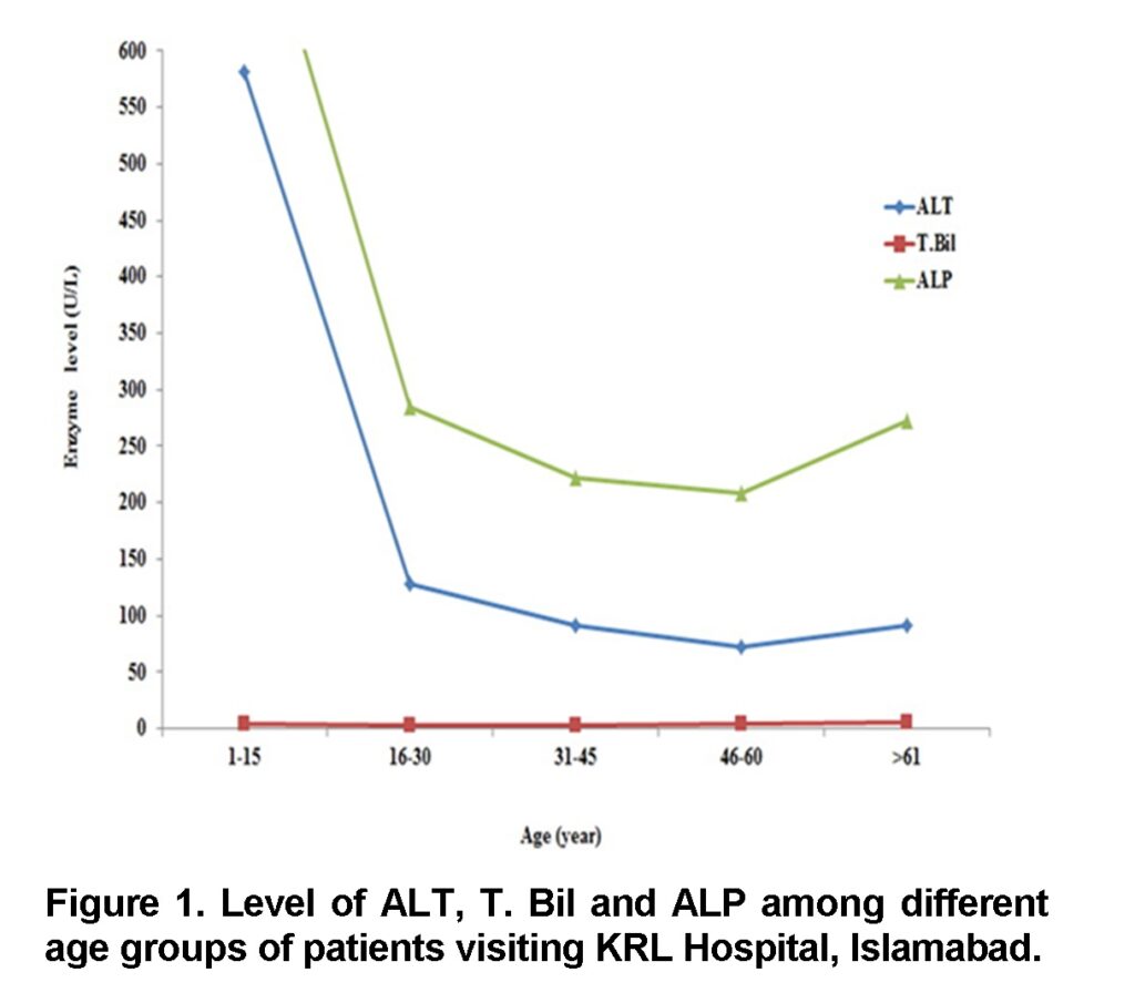 Liver function enzyme tests (LFTs) including Alanine transaminase (ALT), Aspartate transaminase (AST), Alkaline phosphatase (ALP), Albumin, Total bilirubin (T.BIL), Direct bilirubin and Gamma glutamyl transpeptidase (GGT) tests are used as a marker to determine the status of patient’s liver (Haurigan and Bowling, 2001). Medical treatments for liver disorder include surgery, low sodium diet and water pills (diuretics), anti-inflammatory drugs and liver transplantation (Schalm et al., 1997). The main objective of this study was to diagnose and determine the prevalence of liver diseases through liver function enzyme tests (LFTs) in Islamabad, Pakistan.