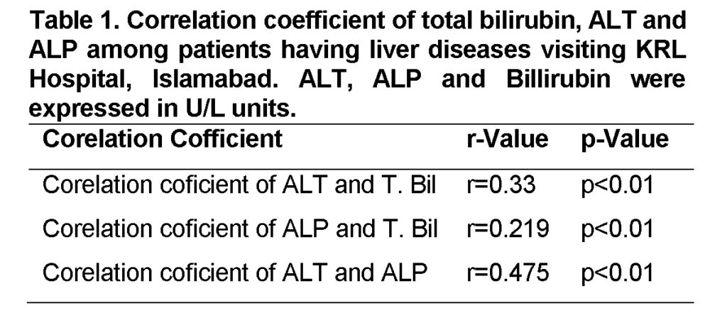 The study was conducted in patients visiting Outdoor Patients Department (OPD) of Kahuta Research Laboratory (KRL) Islamabad for period of five months from September 2012 to January 2013. A total of 250 patients were screened for the presence of liver disorders. A survey was conducted to access the prevalence of liver disorders through liver function enzyme tests (LFTs) viz., alanine aminotransferase (ALT), T. bilirubin, and alkaline phosphatase (ALP) and other information about sex, age, occupation, locality, personal history and socioeconomic status were collected on prescribed questionnaire. Blood samples were collected in 5 ml EDTA coating vacutainers with the help of hypodermic syringe. Blood samples were centrifuged at 3000 rpm for 15 minutes to collect the serum and then serum was stored at 4°C for biochemical analysis. Biochemical tests for ALT, ALP and Bilirubin determination were performed following procedures used by Muhammad et al. (2013). The data was arranged in various groups and was analyzed through Correlation using SPSS version 16.
