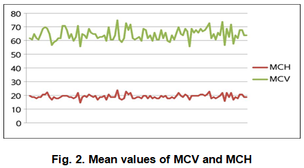 Significantly low Mean corpuscular volume (MCV) and Mean corpuscular hemoglobin (MCH) (Figure 2) was found among all individuals with a mean of 64.55fl and 19.60pg respectively ( Table 1). MCV value <80fl and MCH value <27pg are the significant diagnostic parameters of Thalassemia minor.