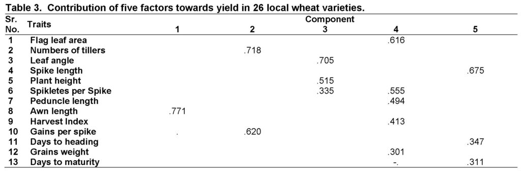 The Assortment method of yield and its component’s relationship is difficult to understand, which can be easily understood by using different types of mathematical analysis (Guertin and Bailey, 1982). By using the multivariate technique it is reported that factor analysis is responsible for involvement of variables in fraction and giving additional information as compared to simple correlation matrix (Biabani and Pakniyat, 2008). Moreover, different types of variables are minimized to hidden factors by factor analysis and provide further knowledge and instructions (Azizi et al., 2001). The present study was planned to differentiate the varieties of wheat depending on their morphological traits relating to yield and to estimate factors responsible for the highest yield plant -1.