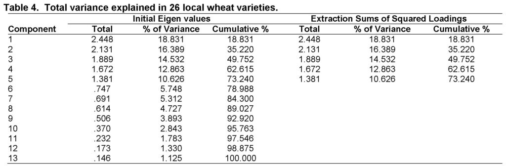 Genetic distinction was overdone by least significant differences within of 26 different types of local wheat samples as presented in Table 1. By applying ANOVA it was found that the traits were significant except for some factors such as, days to headings, leaf angle, plant tallness, harvest index and days to maturity. A trait that was noted to be non-significant should be abused further to get significant results. The seasonal circumstances such as rainwater, temperature variations, wetness contents accessibility, and suitable time of sowing should be in deliberation to achieve maximum productivity of traits that are important (Iqbal et al., 2010).